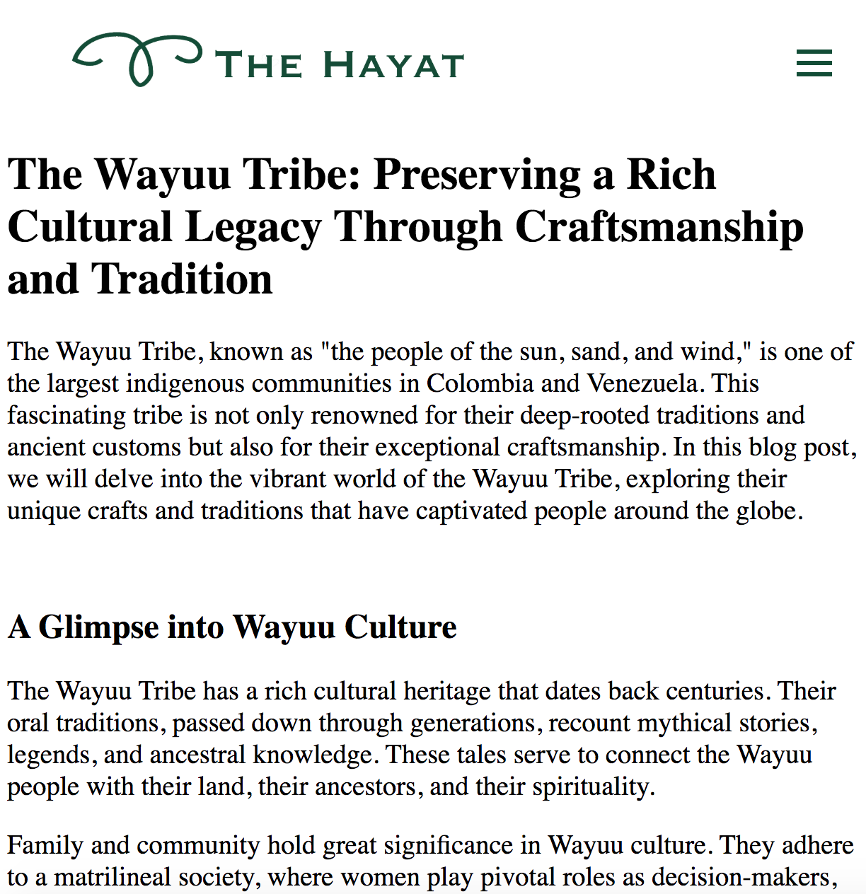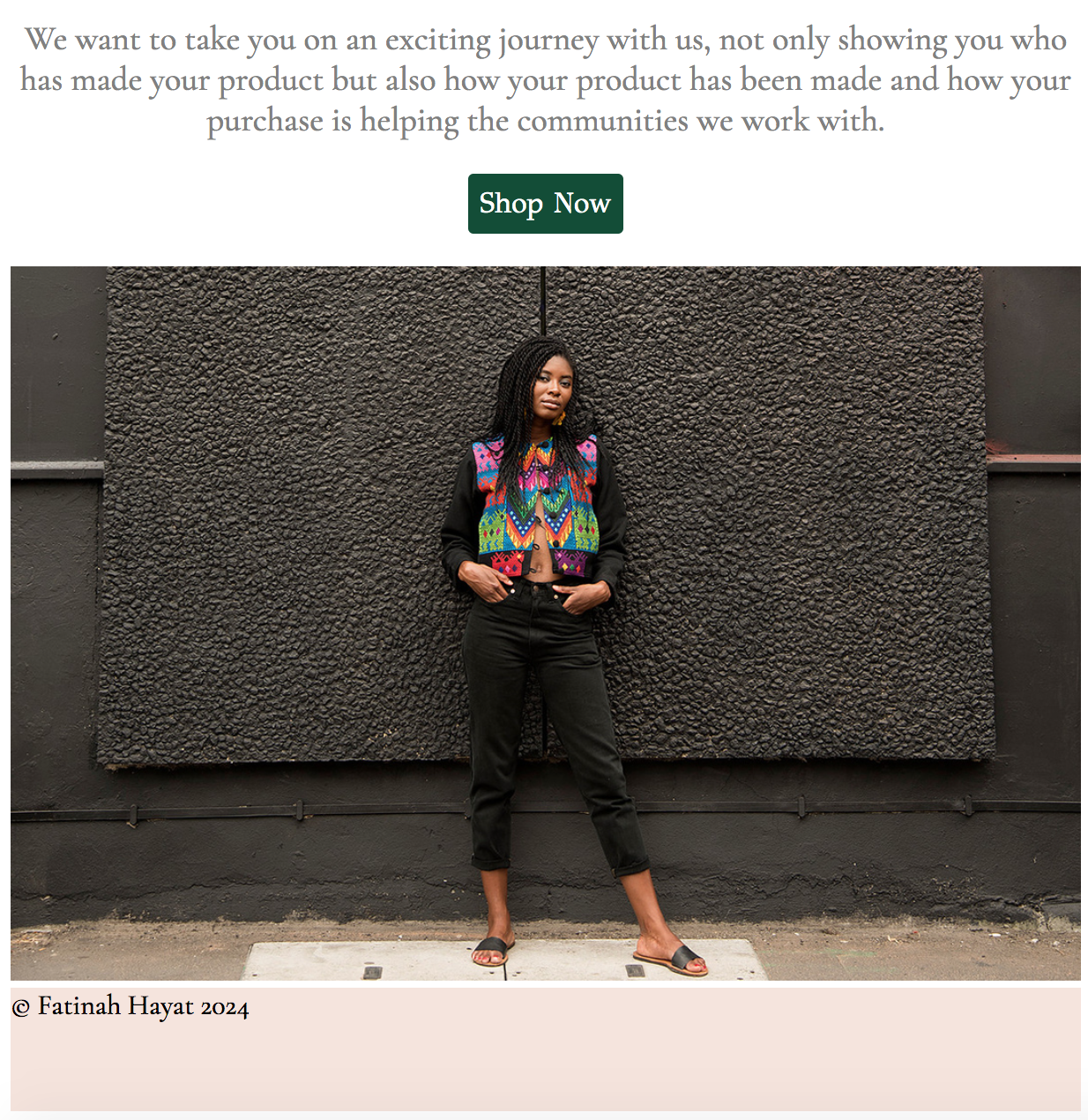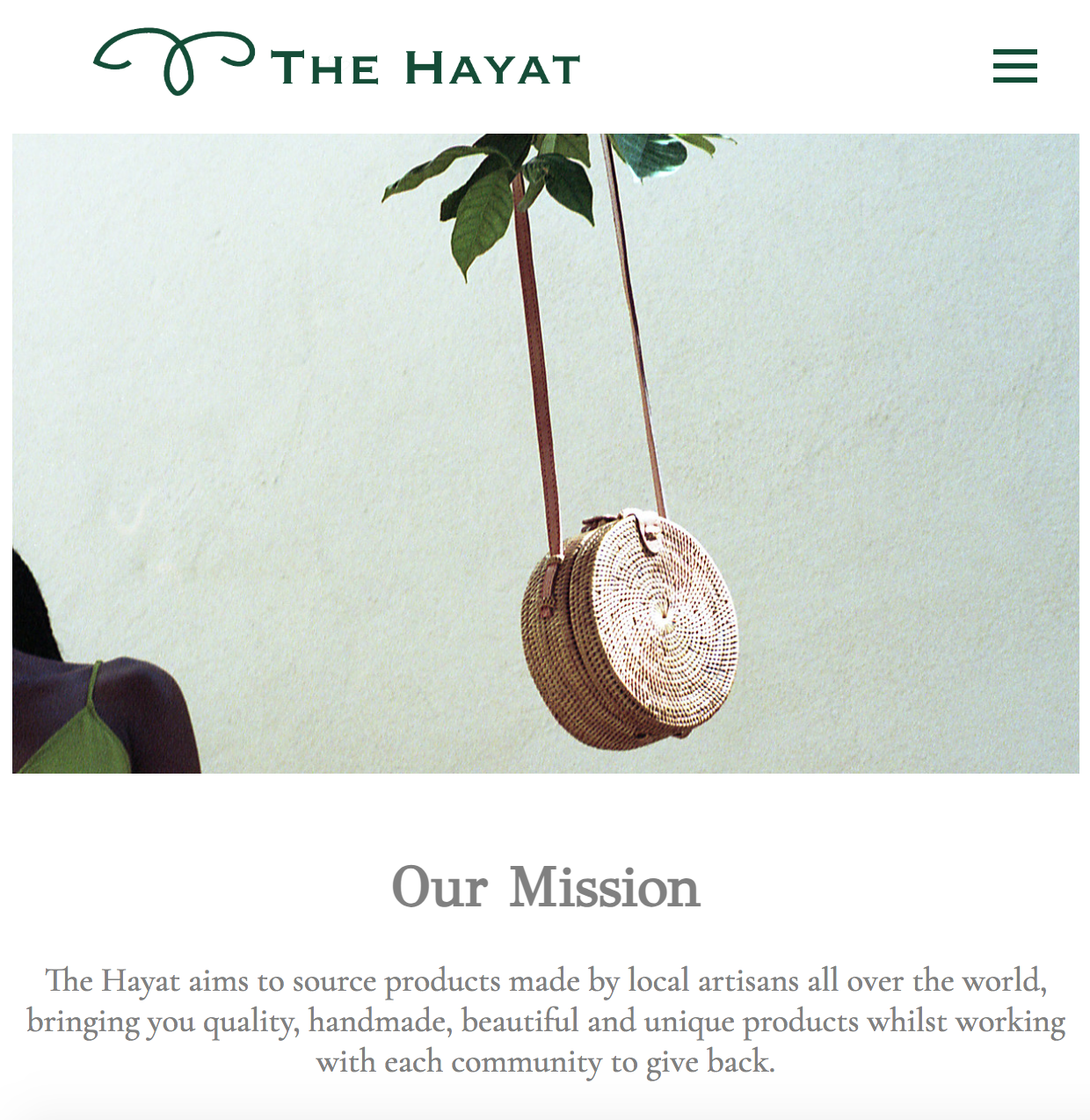 Currently, this is an informative website giving imformation around the products, cultures and traditions of the artisans that create the Hayat products. However, this is a work in progress project with the aim of being built into a full ecommerce site.