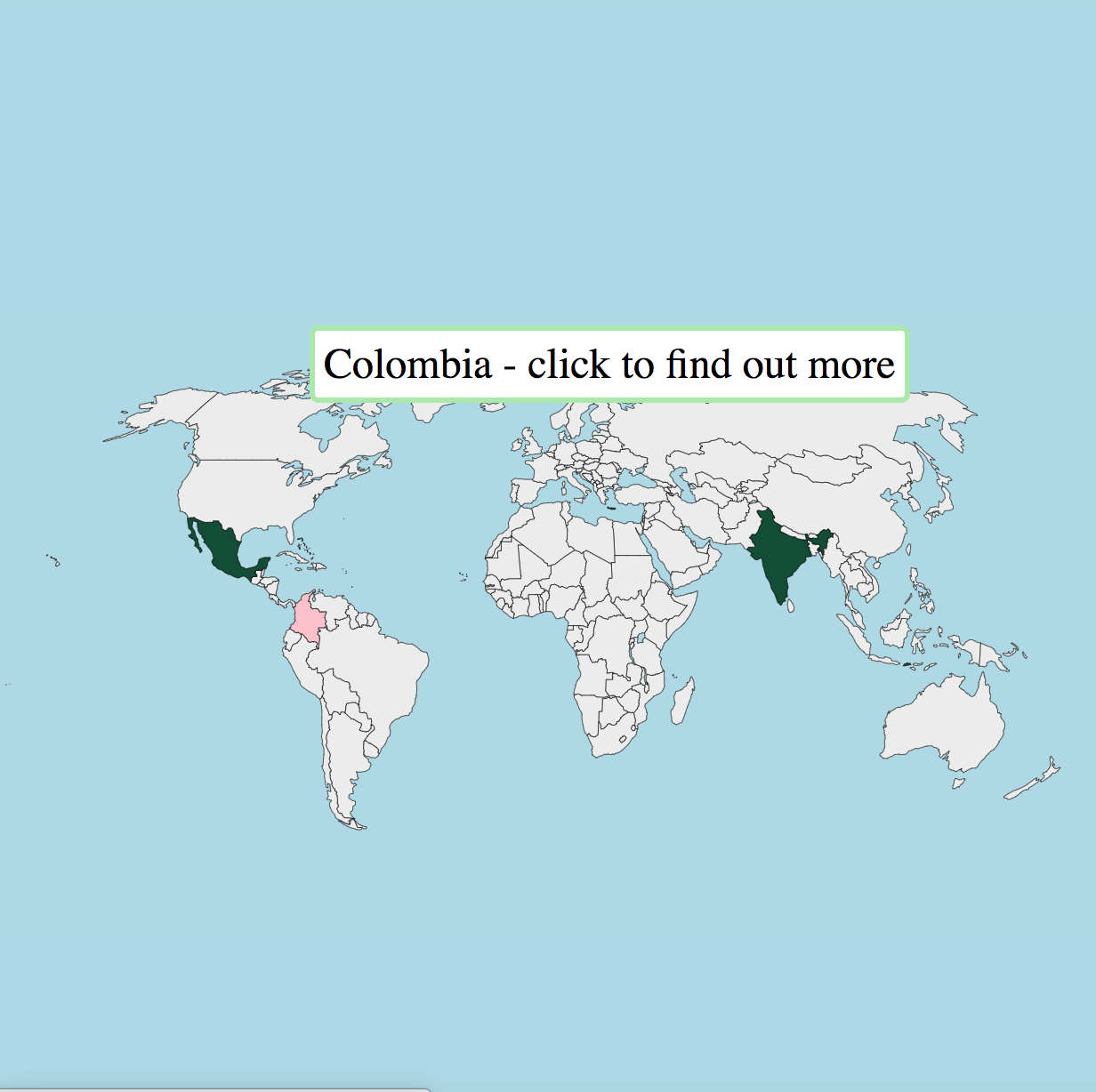 To create the interactive world map, I used a SVG file which I turned into XML code and added to HTML file. I then used an Add Event Listener tool in JavaScript to create the functionality that allows country names to appear when the mouse hovers over each country. When the user clicks on a country which is coloured green, it takes the user to a blog post highlighting information about the artisans and products from that region.